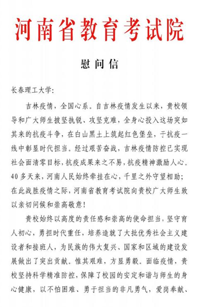 3月初,奥密克戎突袭春城,在疫情大考下,球友会师生无所畏惧,同心战“疫”,取得了防疫工作的阶段性胜利。学校疫情防控工作的进展也时刻牵动着千里之外的河南人民。近日,学校收到了来自河南省教育考试院致球友会师生的慰问信,信中表达了对我校全体师生的亲切问候和崇高敬意。